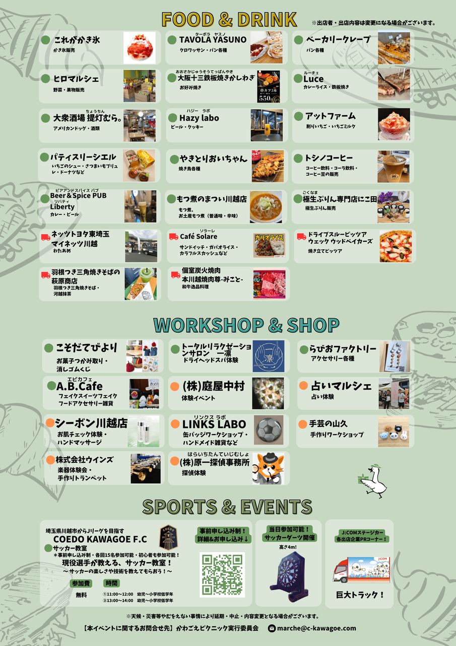 2024年03月27日 缶バッジっワークショップ! LIINKSイベント参加!3/30(土)は「ベノワマルシェ」缶バッジワークショップ開催!ベノワは、フランス語の古語で(幸福な、寛大な)という意味だそう。関わる人の幸せでを願って付けられた名前だとか。実はこの日は、「かわごえピクニック」も開催。 こちらは、30日(土)が天候などの影響で開催できない時には、31日(日)に延期される予定です。「ベノワマルシェ」も中止で「かわごえピクニック」が延期だった場合。リンクスも31日(日)の「かわごえピクニック」に参加予定です。 タグ :#ベノワマルシェ#かわごえぴくにっく#30日#31日#埼玉県#物販#障害福祉#川越#就労支援#就労移行支援B型事業所 「リンクス」カテゴリの最新記事 < 前の記事次の記事 > コメント コメントフォーム 名前 コメント 評価する リセット リセット 顔 星 投稿する 情報を記憶
