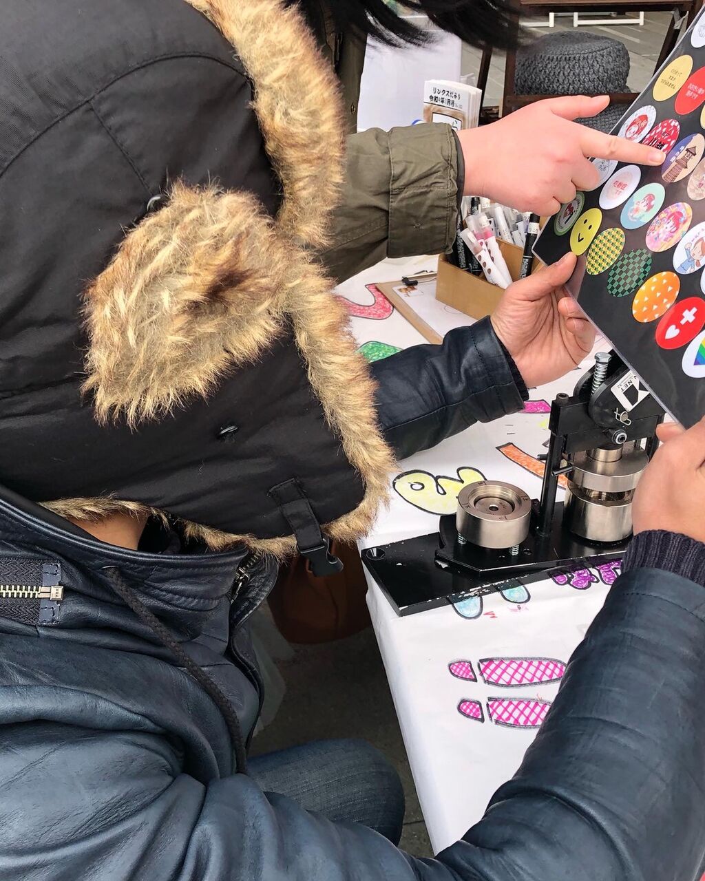極寒+風吹きすさぶ中、缶バッジを作っています!!